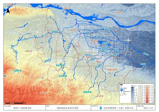 7·20暴雨中心由西南山區(qū)逐漸向東北鄭州市區(qū)發(fā)展,導致城市河道由于山區(qū)暴雨徑流和水庫安全下泄,水位快速抬升,在市區(qū)發(fā)生特大暴雨時,城區(qū)河道排水條件不利。