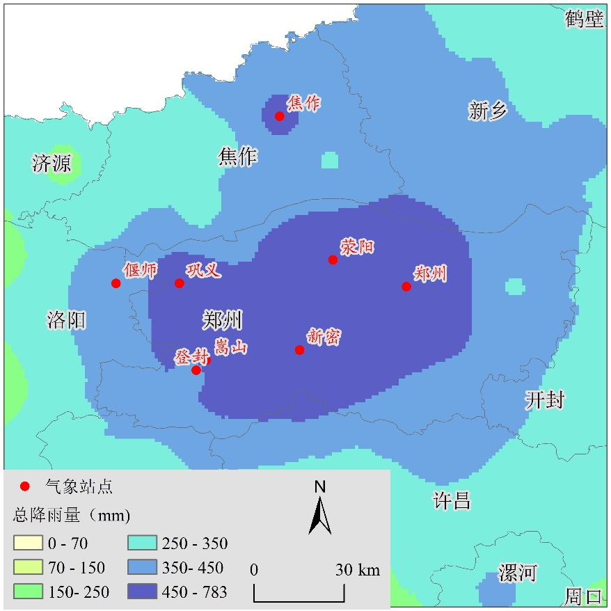 鄭州站位于主城區(qū)偏東北,暴雨主要集中在20日15時~17時,最大小時降雨量達到201.9 mm,最大24h總降雨量超過622 mm。