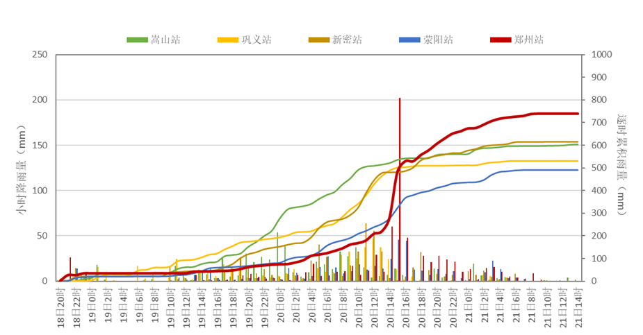 圖 4 鄭州市及西部國家雨量站7.20暴雨逐時和累積降雨量(制圖:宜水環(huán)境)