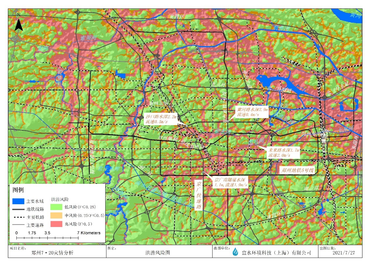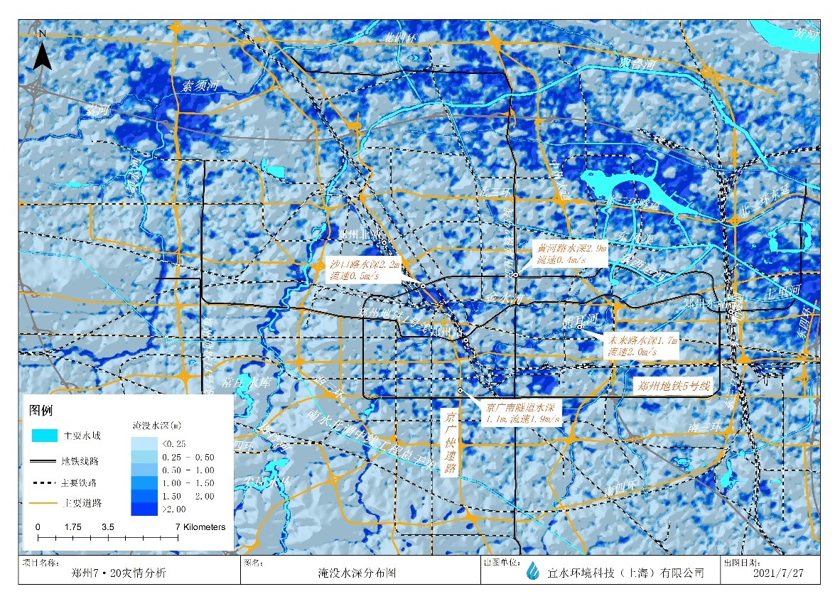 此外,賈魯河、金水河、十八里河和七里河等河道中上游兩岸也存在中、高淹沒風險區(qū),此次鄭州暴雨導致城區(qū)內河道遠超其排水能力。大部分區(qū)域淹沒水深大于0.5米,甚至1-2米,流速大于0.8米/秒,水流風險極大,嚴重影響城市安全。
