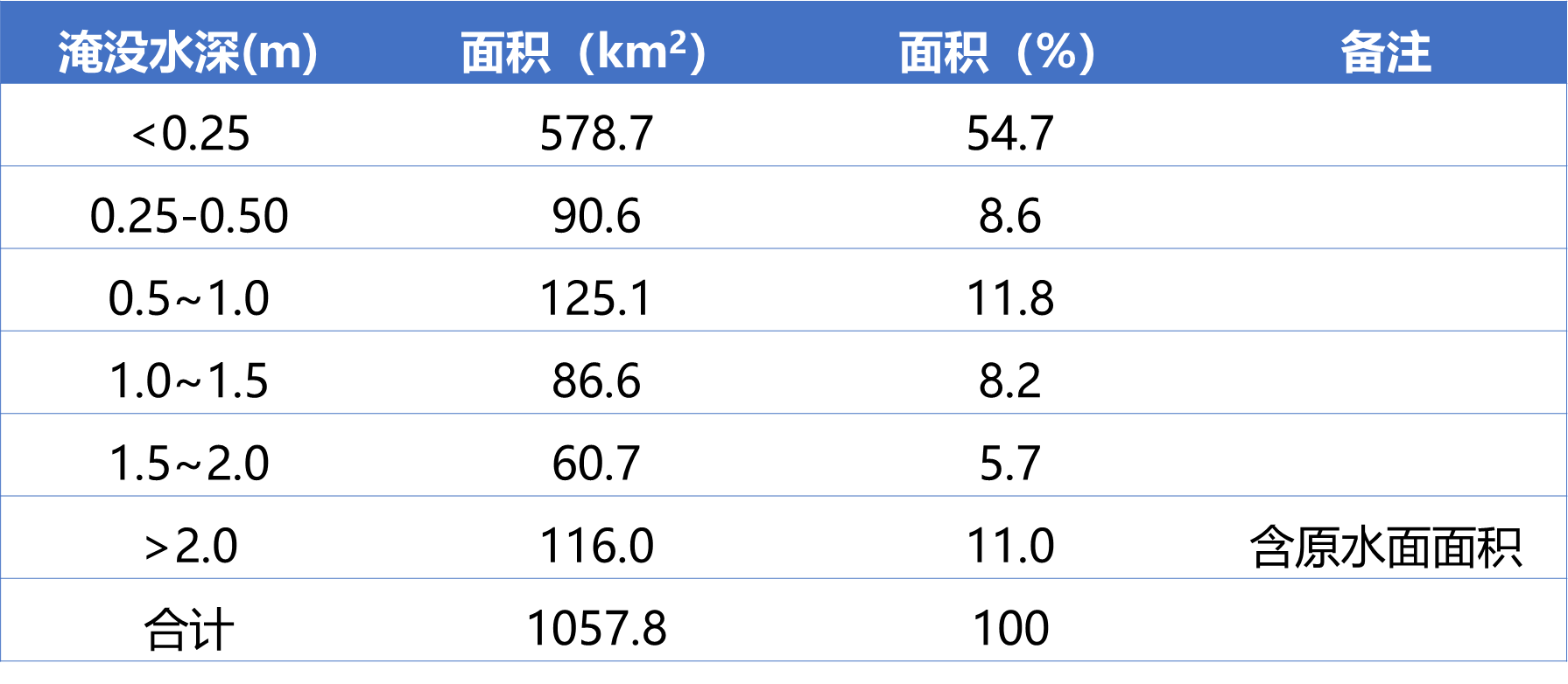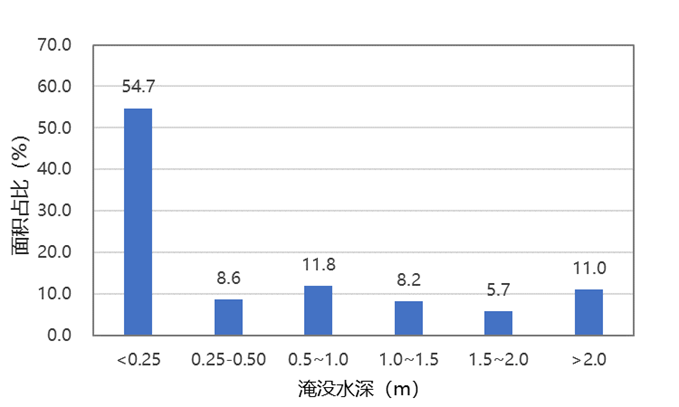 進一步統(tǒng)計淹沒水深面積占比,最大積水深度超過 0.25m的面積為 479.1 km2,占總面積的 45.3%,其中,0.5~2m的面積為272.4 km2,占比25.8%;2m以上的面積達到116.0 km2。