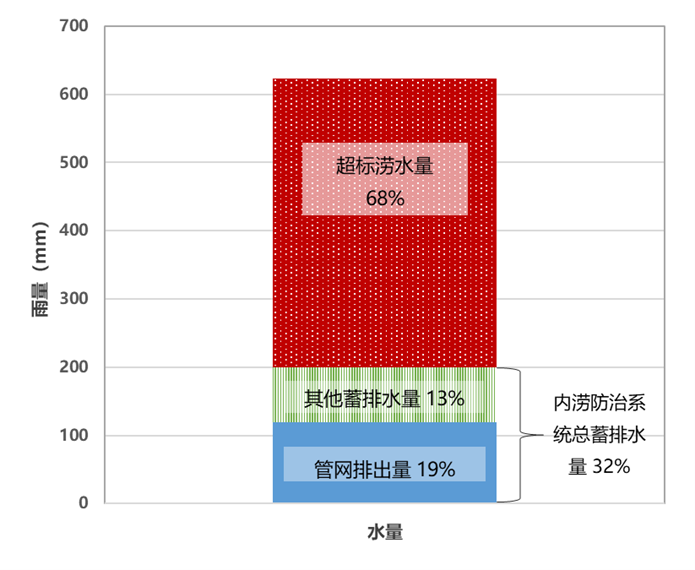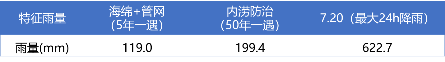 根據(jù)上述特征暴雨雨量分析,管網(wǎng)在設計能力條件下排水量(含海綿設施)占本次極端降雨總雨量的19%,50年一遇防澇系統(tǒng)排水量(含管網(wǎng))約占32%,超標雨水占比達到68%,大量超出內澇防治體系能力標準的雨水將形成快速的地表坡面匯流,流向地勢低洼區(qū)域。