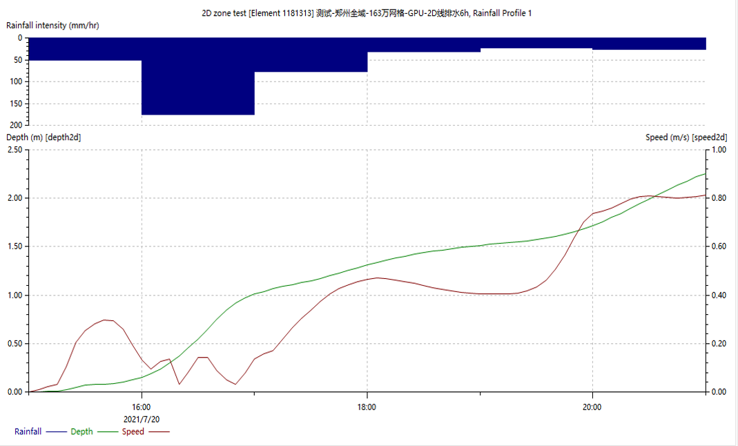 暴雨期間,鄭州市阜外華中心血管病醫(yī)院(簡稱阜外醫(yī)院)因暴雨積水,停水斷電、道路受淹、交通受阻,導致近5000人被困。阜外醫(yī)院所在的城東中牟處于鄭州地勢最低處,賈魯河、魏河、龍湖等水體交匯處下游,暴雨后河水暴漲導致大量積水倒灌,導致路面水位上升速度快、漲幅高,但受地形影響退水速度較慢。通過模擬2021年7月20日15時~7月20日21時間鄭州站實際降雨,結果顯示阜外醫(yī)院周邊區(qū)域水位6小時水位上升可達到2.25m左右。