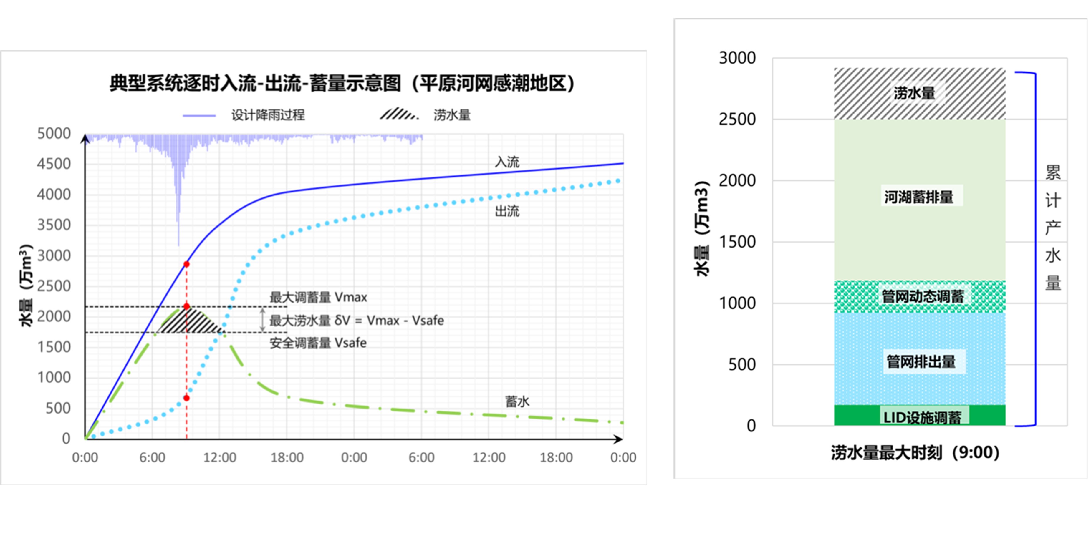 任一排水系統(tǒng)(或子系統(tǒng)),降雨徑流進入系統(tǒng)后,是排水能力與系統(tǒng)調蓄量之間的平衡。當排水能力受限,系統(tǒng)調蓄量超過防洪排澇設計標準安全蓄量時,發(fā)生內澇(見圖11)。