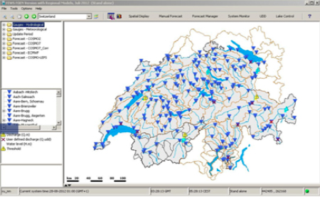 為瑞士水文及地理聯邦政府提供的萊茵河流域上游的洪水預警預報系統。